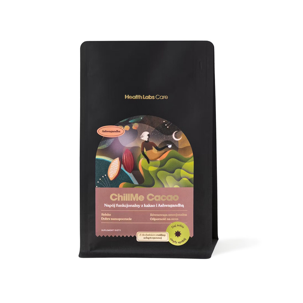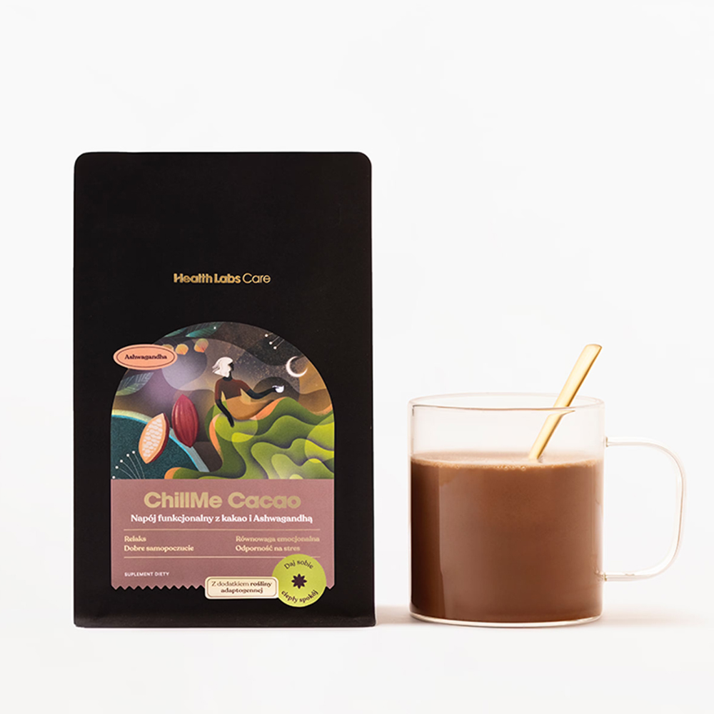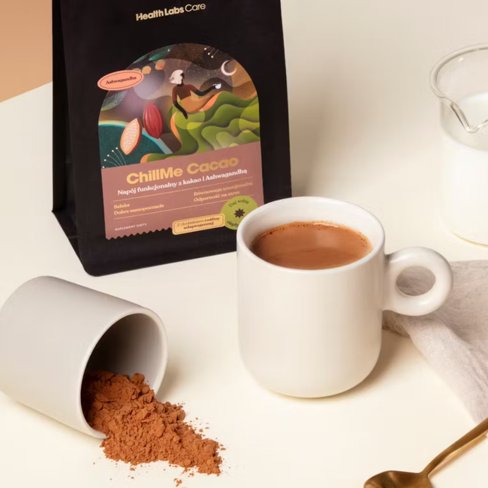 ChillMe Cacao od Health Labs Care. Kakao z ashwagandhą możesz przyrządzić zarówno z mlekiem jak i z wodą. W obu przypadkach będzie smakowało pysznie, mimo że nie zawiera dodatku cukru!