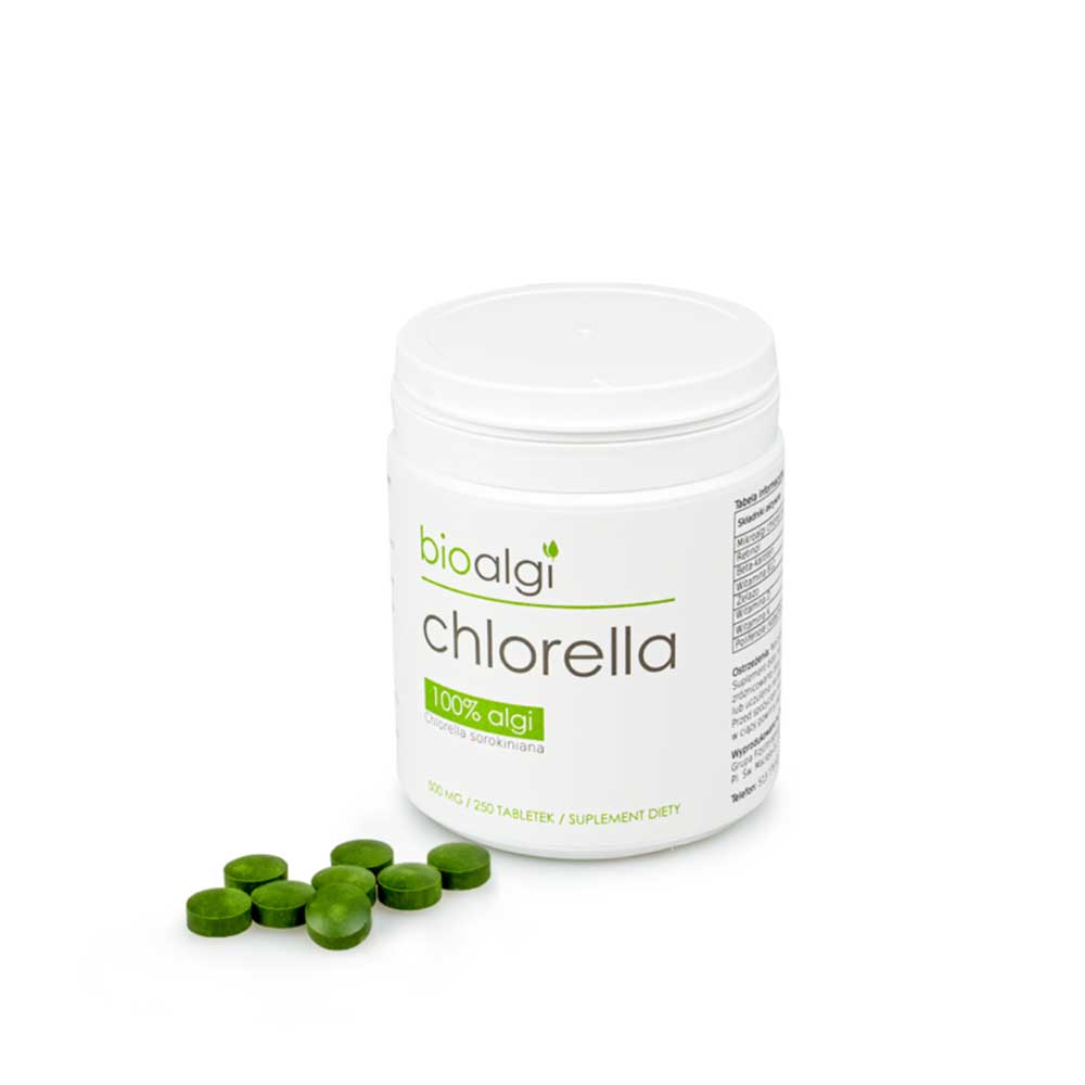 Chlorella z rozerwaną ścianą komórkową to naturalna, słodkowodna alga w tabletkach w postaci suplementu diety. Została wytworzona z suszonych, jednokomórkowych mikroskopijnych alg, należących do gatunku Chlorella sorokiniana. Do składników suplementu diety Chlorella wchodzą wyłącznie mikroalgi wyżej wymienionego gatunku. Otrzymują więc Państwo naturalną i w 100% czystą Chlorellę. Dodatkowo produkt od Bioalgi został poddany specjalnemu (innowacyjnemu) procesowi perforacji, czyli rozerwaniu ściany komórkowej. Pozwoliło to osiągnąć znacznie większą wchłanialność i skuteczność w działaniu (z 40% aż do 80% przy zachowaniu 100% składników odżywczych) w porównaniu do innych Chlorelli na rynku.