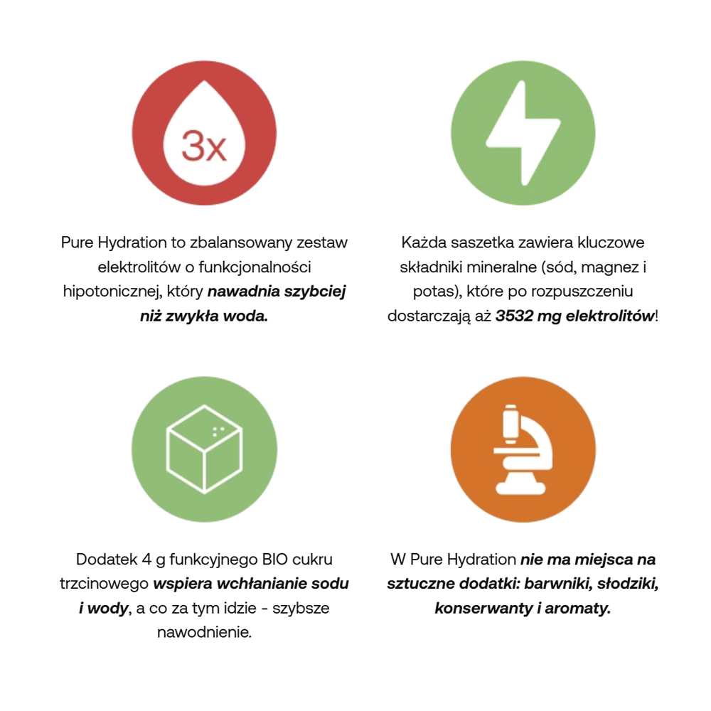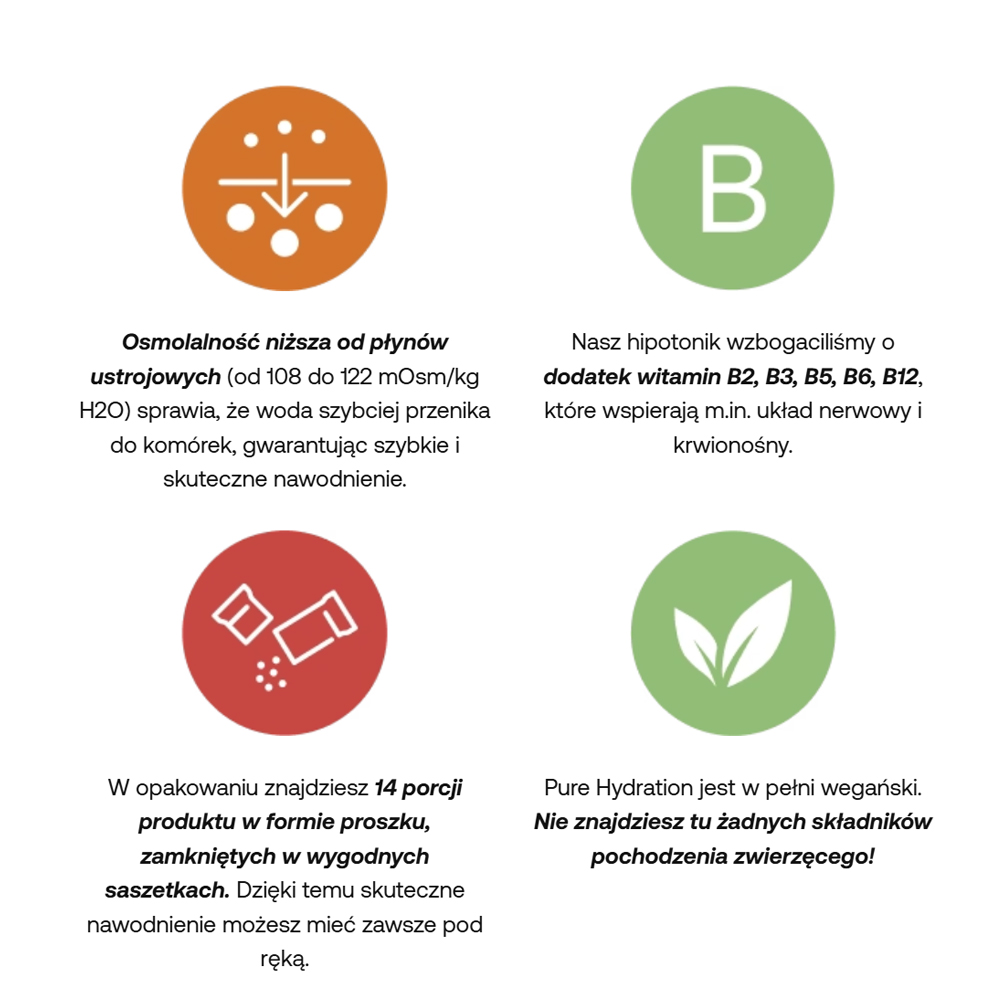 - Elektrolity Pure Hydration Grejpfrut to hipotonik, w którym osiągnięto parametr osmolalności (czyli stężenie substancji rozpuszczonych w 1 kg wody) ok. 3x niższy niż płyny ustrojowe ludzkiego organizmu. Dzięki temu woda jest zaciągana do komórek 3x szybciej i efektywniej niż w przypadku napojów izotonicznych czy czystej wody. Oznacza to, że Pure Hydration pozwala na szybsze wchłanianie wody do komórek oraz uzupełnienie elektrolitów w organizmie.