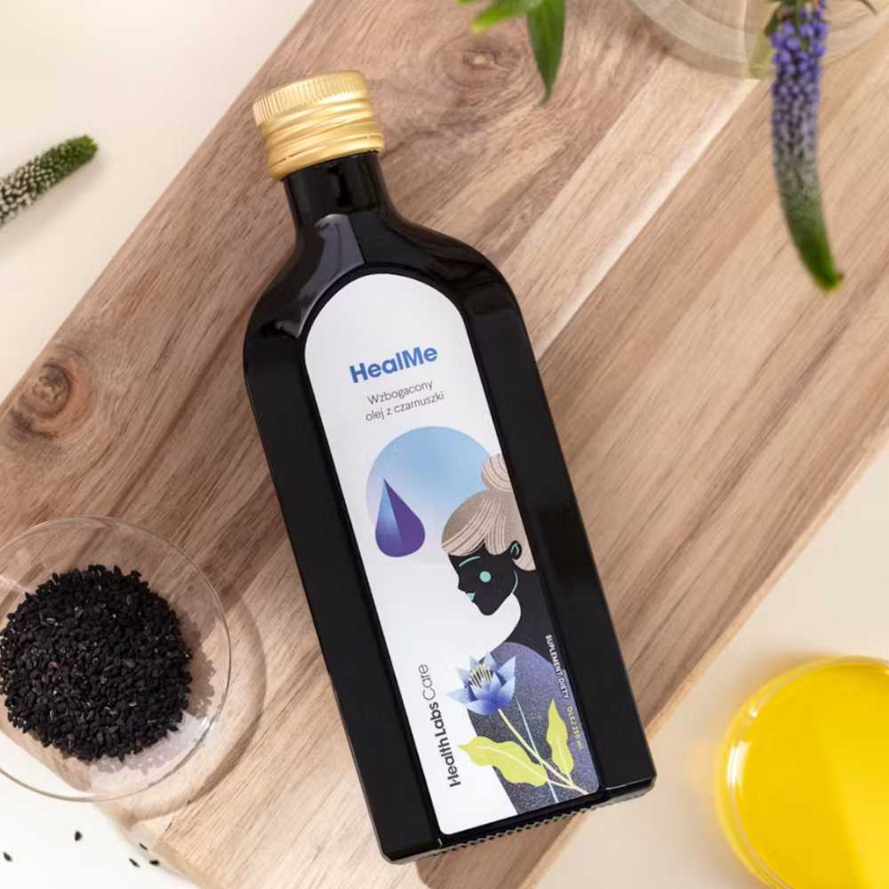 HealMe suplement diety od Health Labs Care to kompozycja oleju z czarnuszki, oliwy z oliwek, olejku majerankowego, witaminy E oraz koenzymu Q10.