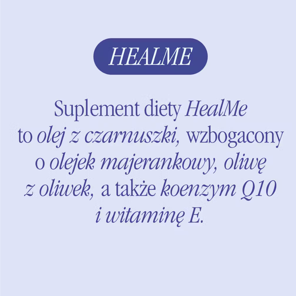 Recepturę suplementu diety HealMe stworzono z myślą o kompleksowym wsparciu organizmu. To kompozycja zimnotłoczonego oleju z czarnuszki, olejku majerankowego, który pozwala poczuć wyciszenie i ukojenie, oliwy z oliwek, koenzymu Q10 i pełnego spektrum witaminy E, która pomaga zwalczyć stres oksydacyjny. Smak i zapach jest intensywnie ziołowy.