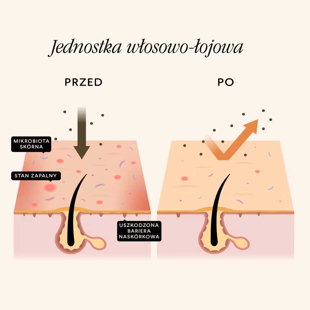 - Filtrat z fermentu soku gruszkowego | Dodatek fermentu z Lactobacillus (Lactobacillus/Pear Juice Ferment Filtrate) wspiera mikrobiotę skóry i pomaga przywrócić jej równowagę, co ma pozytywny wpływ na stan skóry problematycznej. Osoby ze skórą problematyczną często borykają się z dysbiozą (nierównowagą mikrobioty skóry). Przewaga niektórych (IA1) szczepów bakterii C. acnes o większej patogenności sprawia, że osoby te są bardziej narażone na powstawanie niedoskonałości.