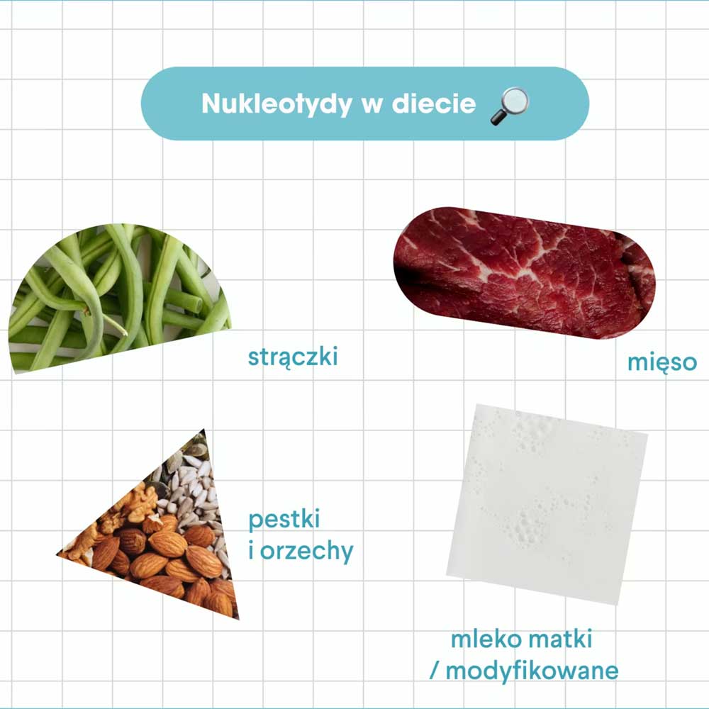 Nukleotydy są składnikiem produktów bogatych w białko, takich jak podroby, mięso, rośliny strączkowe, nasiona, orzechy. Są też w mleku matki, a także modyfikowanym, podawanym niemowlętom. Jeśli Twoje dziecko ma wybiórczą dietę, nie spożywa produktów mięsnych lub strączkowych, warto wówczas uzupełnić jego dietę w nukleotydy dietetyczne.