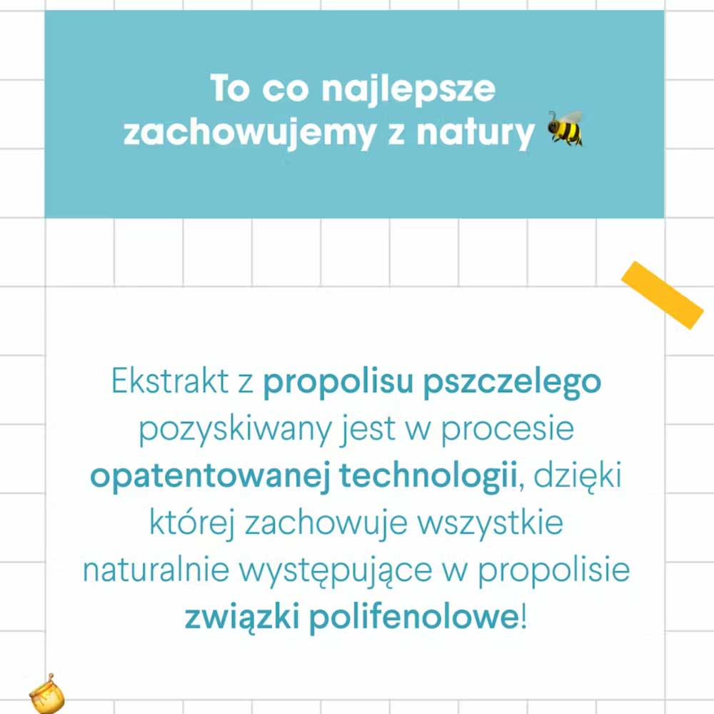 - Propolis standaryzowany na 12% polifenoli, pozyskiwany opatentowaną technologią dla maksymalnej czystości i skuteczności.