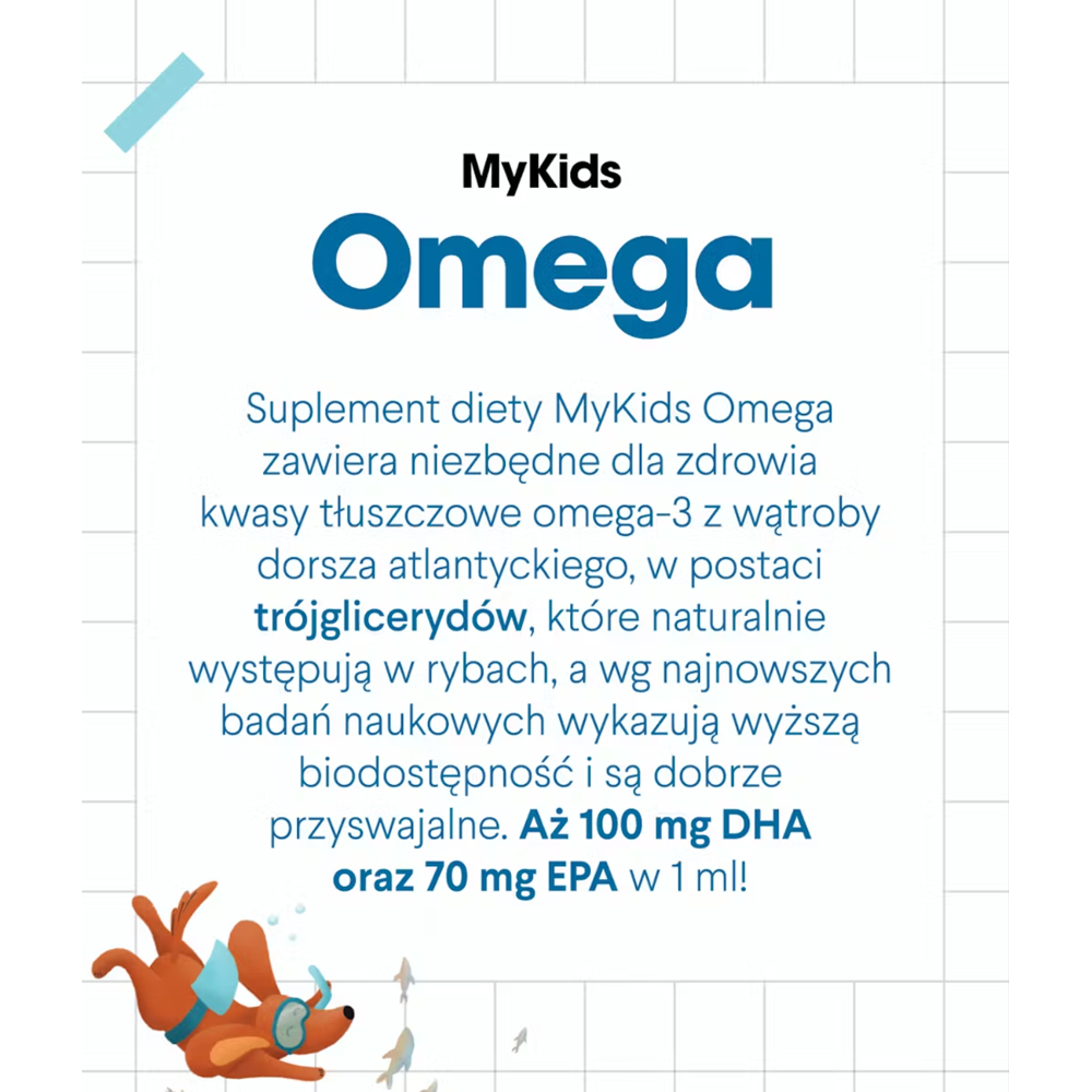 - Sprawdzone źródła| Użyty w MyKids Omega olej z wątroby dorsza jest pozyskiwany z ryb pochodzących ze zrównoważonych połowów na międzynarodowych, legalnych i dobrze zarządzanych łowiskach. Suplement diety MyKids Omega zawiera trójglicerydy kwasów tłuszczowych omega-3, więc możesz być spokojna, że podajesz swojemu dziecku to, co najlepsze!