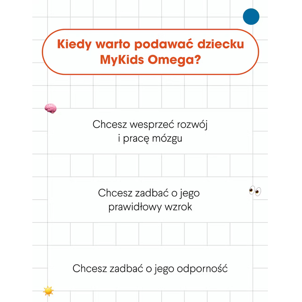 - Kwasy omega-3 to podstawa suplementacji, dlatego rekomendujemy regularne stosowanie MyKids Omega przez cały rok dla najlepszych rezultatów.
