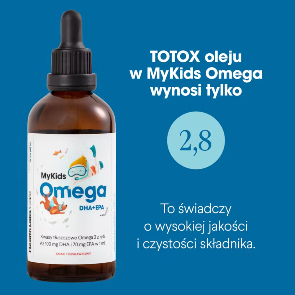 MyKids Omega suplement diety Health Labs Care. Kwasy tłuszczowe omega 3 są niezbędne do prawidłowego funkcjonowania organizmu, w tym: przyczynia się do prawidłowego funkcjonowania mózgu (DHA)¹, wspiera dobry wzrok (DHA)¹, pomaga utrzymać prawidłową pracę serca (EPA i DHA)². TOTOX 2,8!