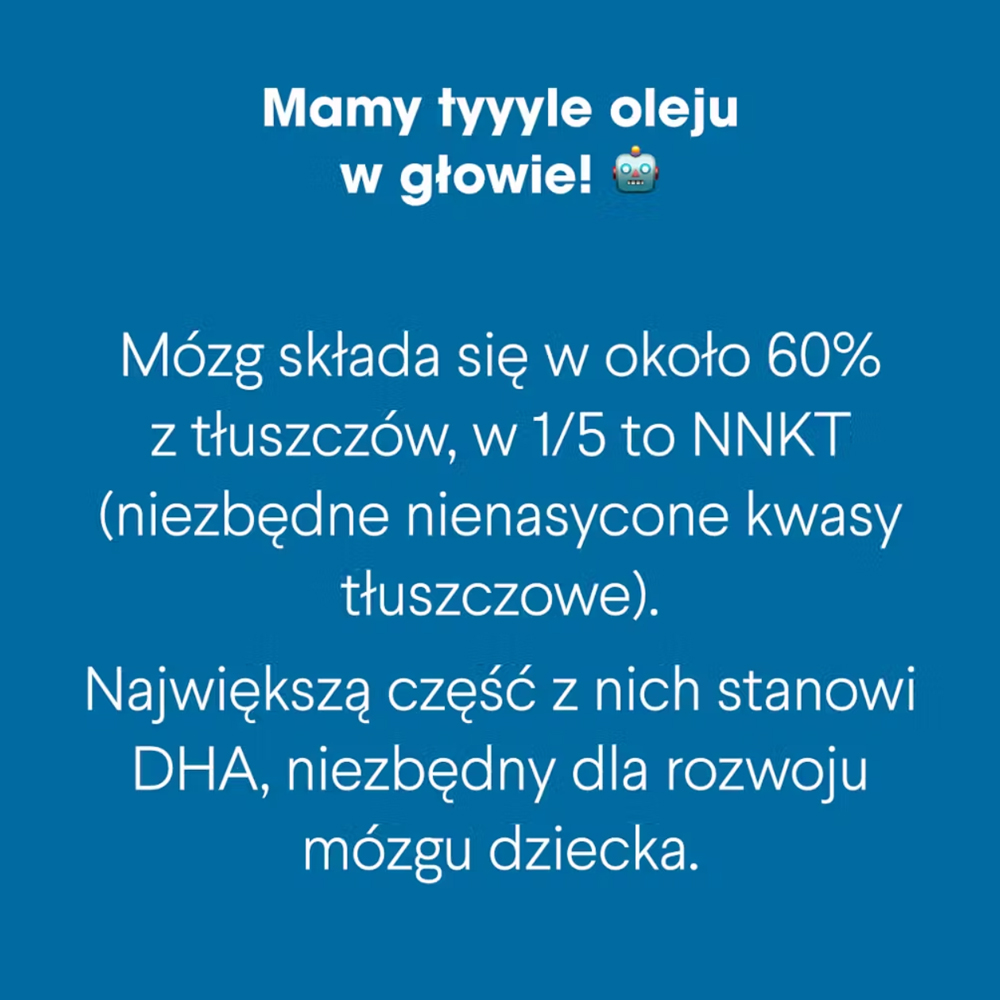 - ¹ Kwas dokozaheksaenowy (DHA) przyczynia się do utrzymania prawidłowego funkcjonowania mózgu i widzenia. Korzystne działanie występuje w przypadku spożywania 250 mg DHA dziennie.