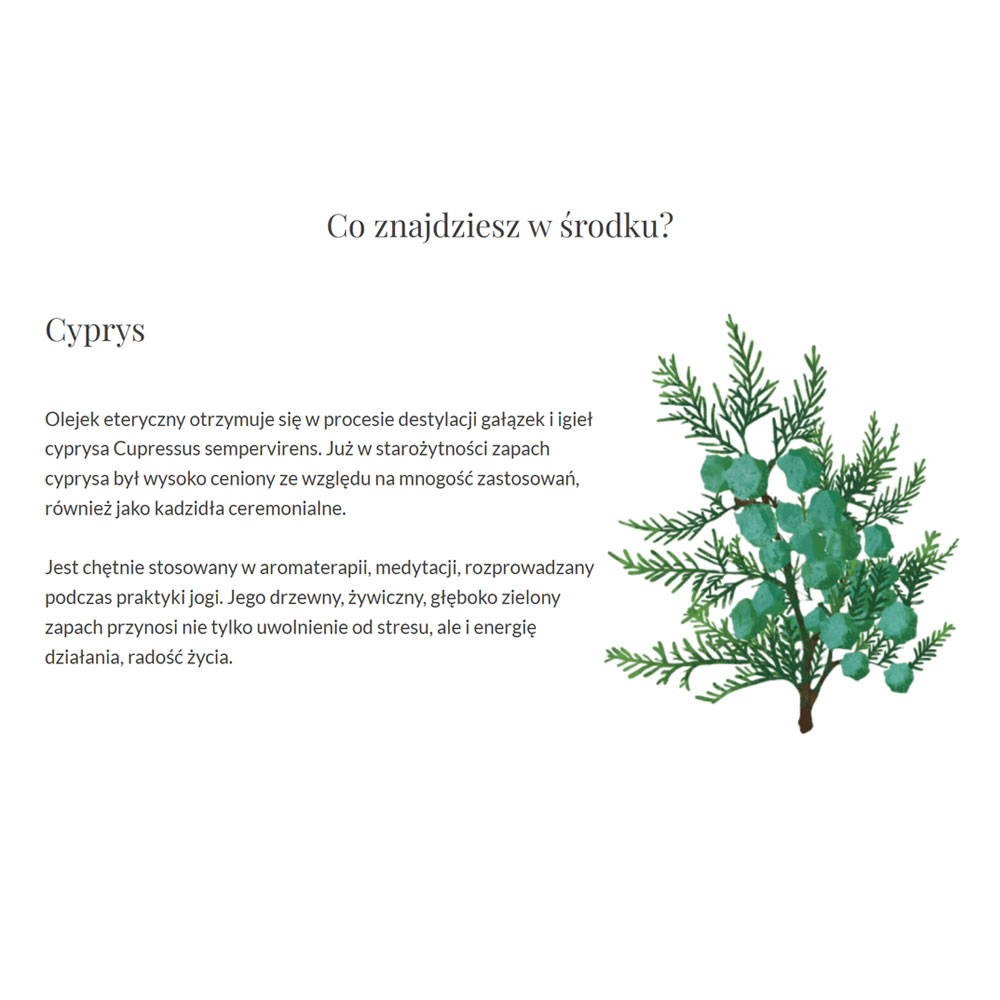 Wiedz, że masz coś, co zadziała NATYCHMIAST. Olejek otuli Cię zapachem cyprysowego lasu z nutą paczuli, amyrisu i lawendy. Pomoże zmyć z siebie ciężkość dnia i pozostawić na skórze tylko to, co dobre i świeże. Cyprys – zwykły olejek pod prysznic lub do wanny, który robi niezwykłe rzeczy. Przynosi ulgę i wyciszenie po całym dniu. Zanurz się w zmysłowej kąpieli lub weź aromatyczny prysznic.