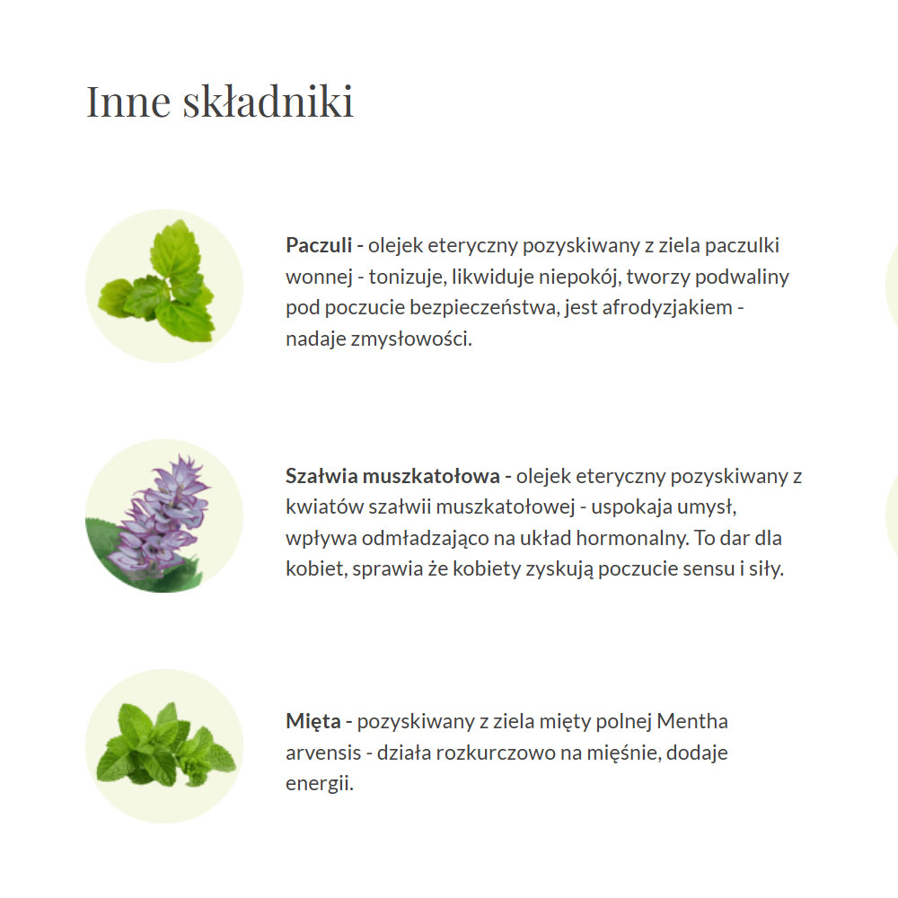 - Szałwia muszkatołowa – olejek eteryczny pozyskiwany z kwiatów szałwii muszkatołowej – uspokaja umysł, wpływa odmładzająco na układ hormonalny. To dar dla kobiet, sprawia że kobiety zyskują poczucie sensu i siły.⠀