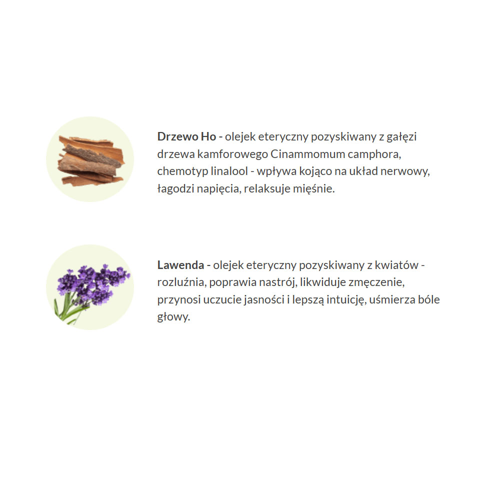 - Drzewo Ho – olejek eteryczny pozyskiwany z gałęzi drzewa kamforowego Cinammomum camphora, chemotyp linalool – wpływa kojąco na układ nerwowy, łagodzi napięcia, relaksuje mięśnie.