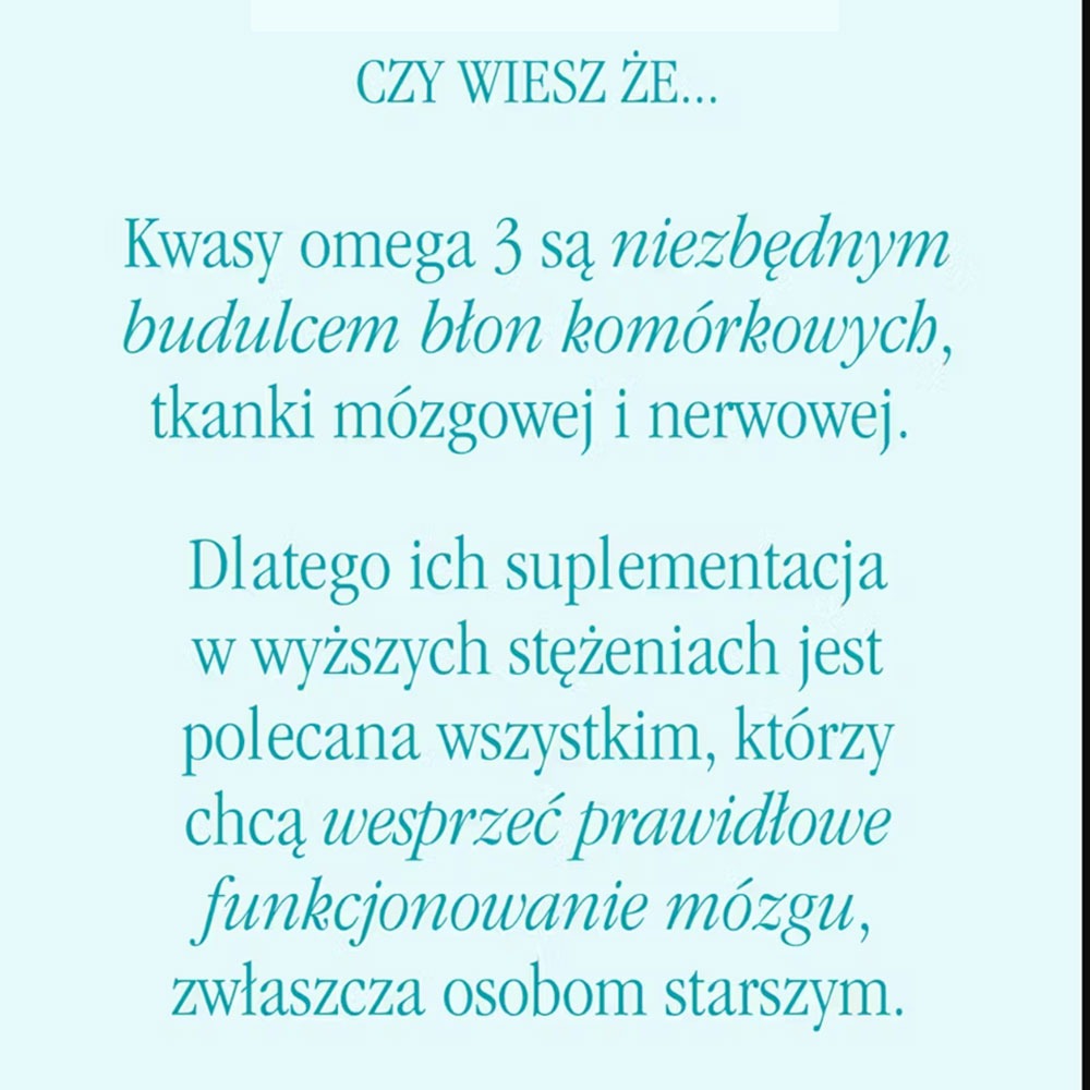 „Kwasy tłuszczowe omega 3 wspierają wiele obszarów organizmu. Głównym źródłem kwasów tłuszczowych EPA i DHA są ryby morskie, dlatego warto spożywać je 2-3 razy w tygodniu. Polecam spożywanie większej ilości kwasów omega 3 DHA i EPA w szczególności w przypadku osłabienia organizmu, a z uwagi na korzystny wpływ na mózg, także osobom pracującym, uczącym się oraz wszystkim, którzy chcą zatroszczyć się o pamięć. Formuła została wzbogacona o witaminę A i witaminę D, które pomagają m.in. w prawidłowym funkcjonowaniu układu odpornościowego.” dr Paulina Ihnatowicz