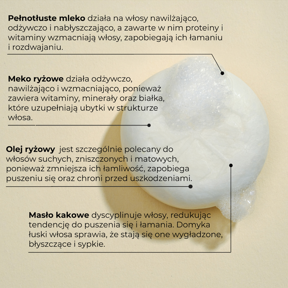 Szampon w kostce RYŻ NA MLEKU jest bardzo łagodny, świetnie sprawdzi się w codziennej pielęgnacji skóry wrażliwej i skłonnej do alergii. Szampon w kostce RYŻ NA MLEKU wyróżnia się bardzo przyjemnym zapachem kokosa i wanilii, bogatym składem oraz bezproblemową aplikacją. Jego skład bazuje na mleku ryżowym, masłach i olejach roślinnych, które nadaje włosom blasku i objętości.