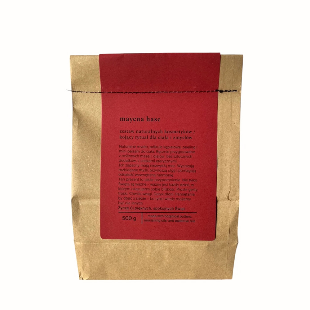 Zestaw zapakowany jest w torbę z jakościowego kratowego papieru, z etykietą niosącą specjalne przesłanie. To słowa przypominające, że dbałość o siebie nie jest luksusem, ale koniecznością – bo dbając o siebie możemy być w pełni obecni dla innych.